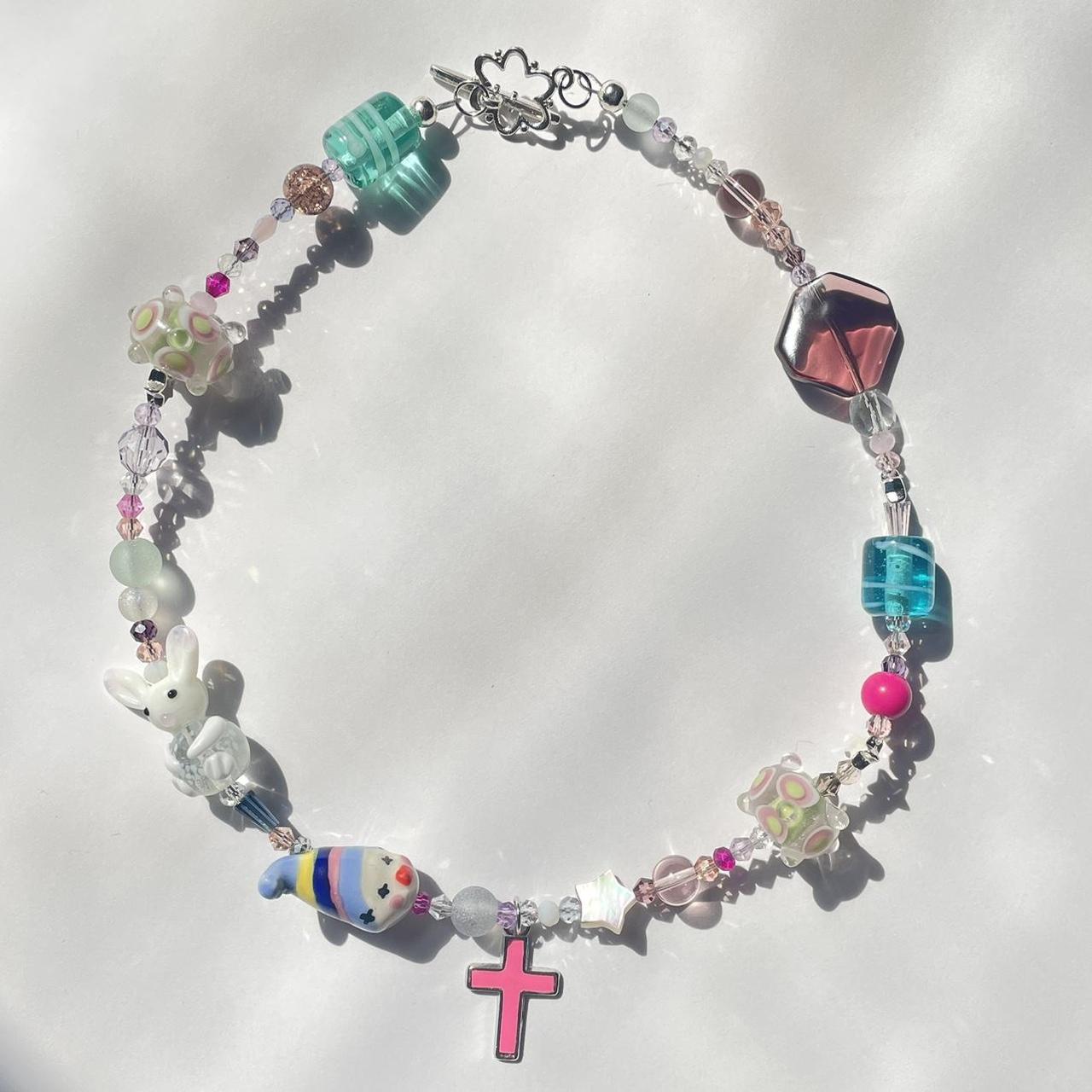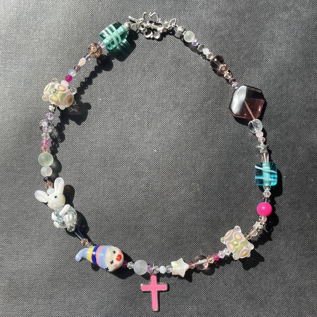 • handmade with glass, lampwork, porcelain, crystal beads, freshwater pearls, and cross pendant